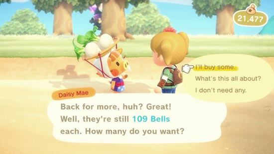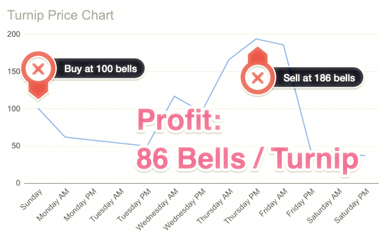 가격은 주로 90~100벨(이상) 정도로 포진이 되며 낮은 가격이라고 생각되는 가격대에 사서 평일에 파는 방식입니다. 이때 무의 가격은 오전과 오후마다 다르므로 수시로 상점에 방문하여 가장 비쌀 때 팔면 됩니다.